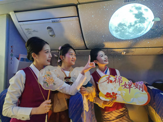 当航班穿越云层,一轮明月高悬天际,客舱内光影流转,顶部动态投影生动再现“举杯邀明月”“千里共婵娟”的经典诗意场景。这一刻,古人曾仰望的同一轮明月,依旧照耀着当代人的旅途;从长安古城的灯火到阿拉木图的晨光,南航用一次飞行,连接起千年文明的历史回响。这场主题活动并非简单的节日庆祝,更是南航践行“让更多人乐享美好飞行”企业使命的深情表达。南航西安分公司相关负责人表示:“我们始终相信,飞行的意义不仅在于抵达目的地,更在于旅途中那些被文化点亮的温暖瞬间。”
