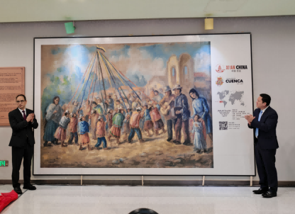 此次揭幕的壁画为《图库曼之舞》,由埃米利奥·洛萨诺·帕拉创作。作品以绚丽的色彩与生动的笔触,鲜活再现了承载着厄瓜多尔文化根脉的缎带舞场景。作为艺术技艺与文化外交的结晶,这幅壁画既是对西安市和昆卡市结好15周年的隆重纪念,也是中厄建交45周年之际文化交流的珍贵成果。