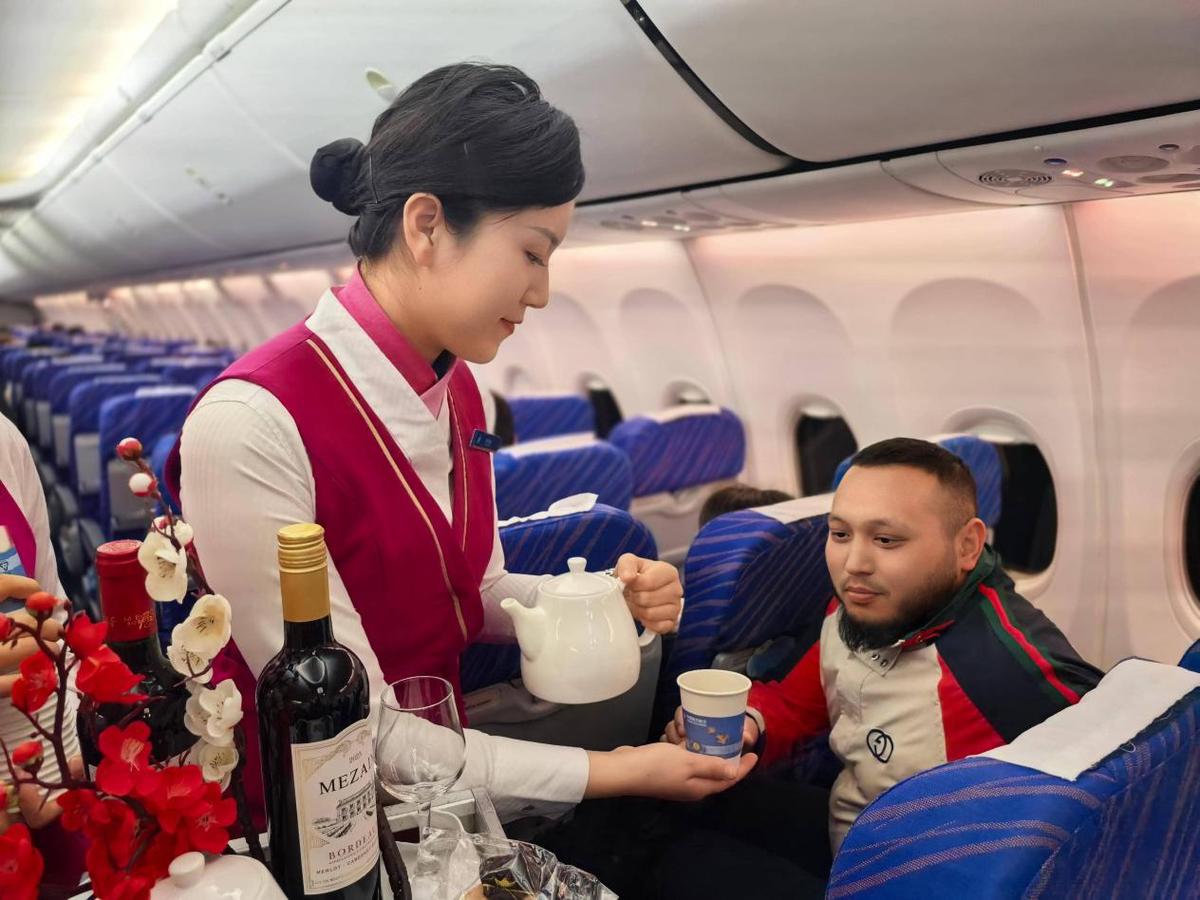 航班平稳飞行后,丰富的主题活动陆续展开。餐饮服务环节,暖身的菊花茶搭配融合中西风味的餐食,为旅客驱散高空寒意。随后的“立冬民俗小课堂”互动环节更是点燃了全场热情,乘务组精心设计的问答题目涵盖立冬节气知识与丝路冬日习俗,从“立冬是二十四节气中的第几个节气”到“丝路沿线冬酒储存饮用的传统”,趣味十足的问题让国际首乘的旅客们踊跃参与,在欢乐互动中加深了对中国传统文化与丝路文明的理解。