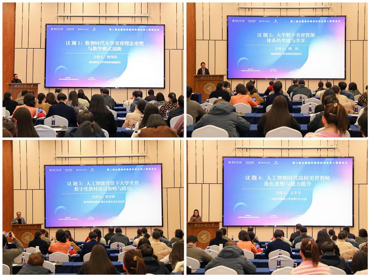当日下午,会议设置四大分会场同步开展互动研讨,分别聚焦“数智时代大学美育理念重塑与教学模式创新”“大学数字美育资源体系的共建与共享”“人工智能背景下大学美育数字化教材建设策略与路径”“人工智能时代高校美育教师角色重塑与能力提升”四大议题。各分会场从宏观架构到具体举措,深入探讨当前美育工作的思路、困境与解决方案,形成多项共识,搭建起高效的交流互鉴平台。