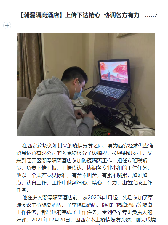 在隔离专班中,有一名入党积极分子,自2020年1月以来,一直处在防疫一线,先后参加了多个隔离酒店的防疫工作,于2021年12月21日又加到潮漫隔离酒店的防疫工作中来。临时党支部及时向上级党组织反映其工作学习情况,使他早日实现加入党组织的要求。