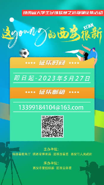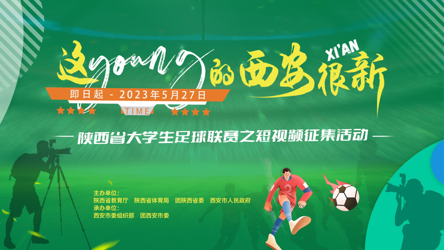 为充分调动陕西高校大学生参与西安城市、陕西高校形象建设工作的热情,全面宣传展示“Z世代”青年眼中的西安形象、陕西高校形象,由陕西省教育厅、陕西省体育局、团陕西省委、西安市人民政府主办,西安市委组织部、团西安市委承办的“这young的西安很新xi'an”陕西省大学生足球联赛之短视频征集活动即日起正式启动。