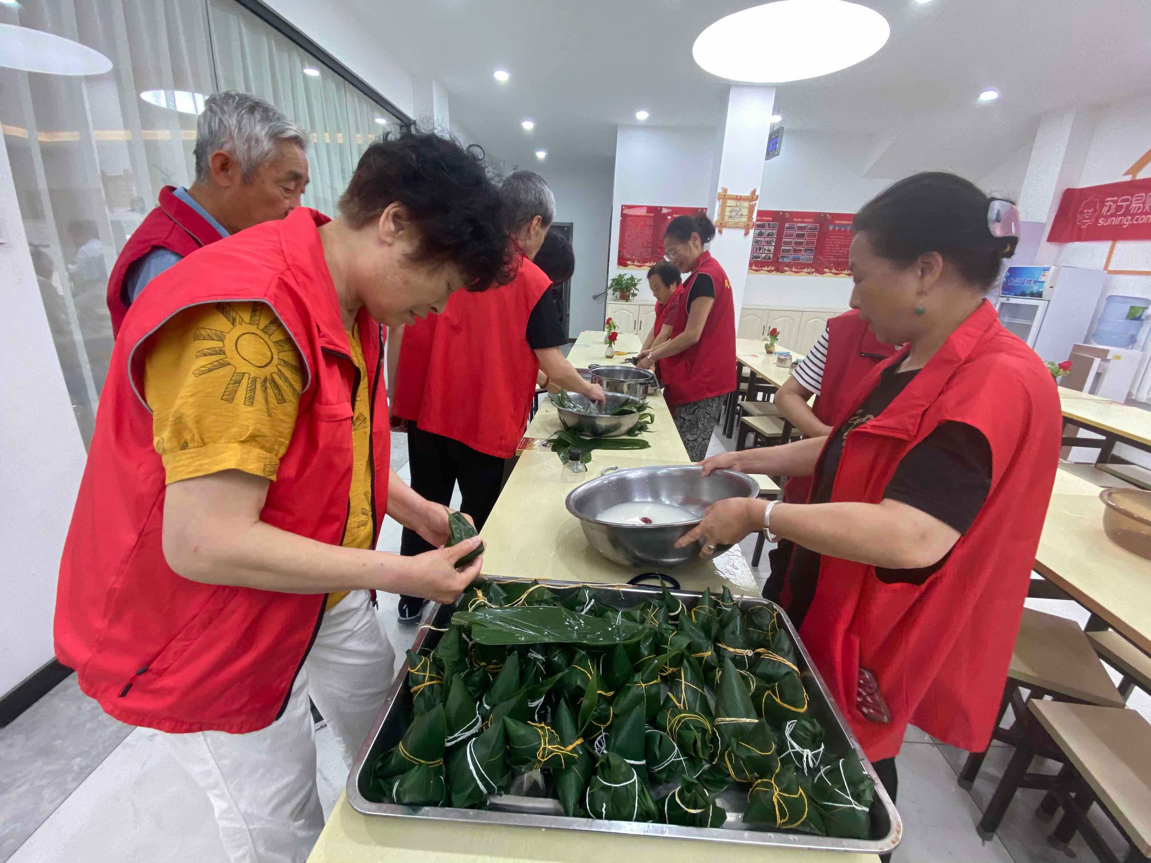 6月6日,在咸阳市秦都区渭滨街道704社区食堂,社区文化志愿队的志愿者早早就开始包制“爱心粽”。“这些粽子是给在社区食堂就餐的老人们做的。我们一大早就将糯米和红枣泡上了,包的时候会多加些水。这样粽子会更软糯、更好消化。”志愿者李安玲一边包粽子一边说。