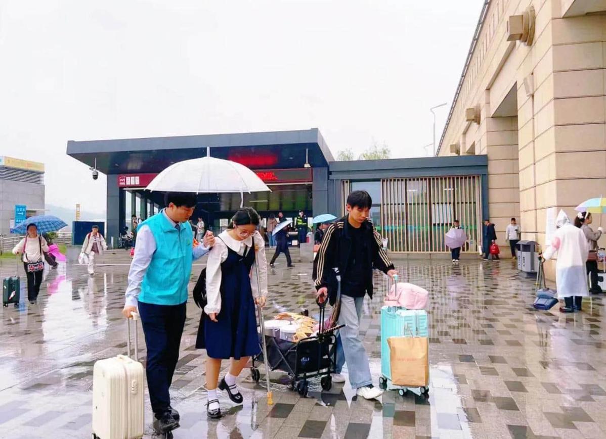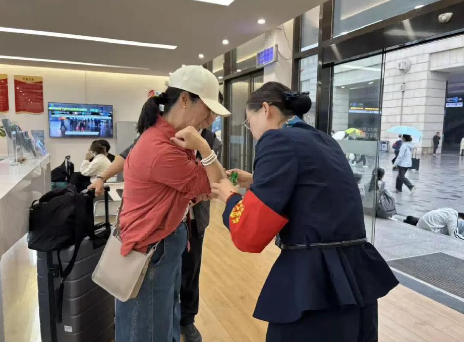 这个假期,服务中心工作人员张欢欢为一位手臂受伤的旅客及时清洁包扎伤口,用轻柔的动作与暖心的话语缓解旅客的紧张与疼痛;在细雨微凉的午后,北广场地砖湿滑,工作人员张雪毅、田舒苗、王佳欣巡逻时发现一位拄拐旅客,便主动上前撑伞、搀扶、拎行李,将其护送至服务中心休息,旅客感动地写下感谢信:“雨天拄拐本慌累,你们比家人还周到!”工作人员折钰茹则关注到带娃旅客的疲惫与焦虑,主动引导至休息区,并送上儿童绘本安抚哭闹的孩子,小小的举动温暖了整个归途。