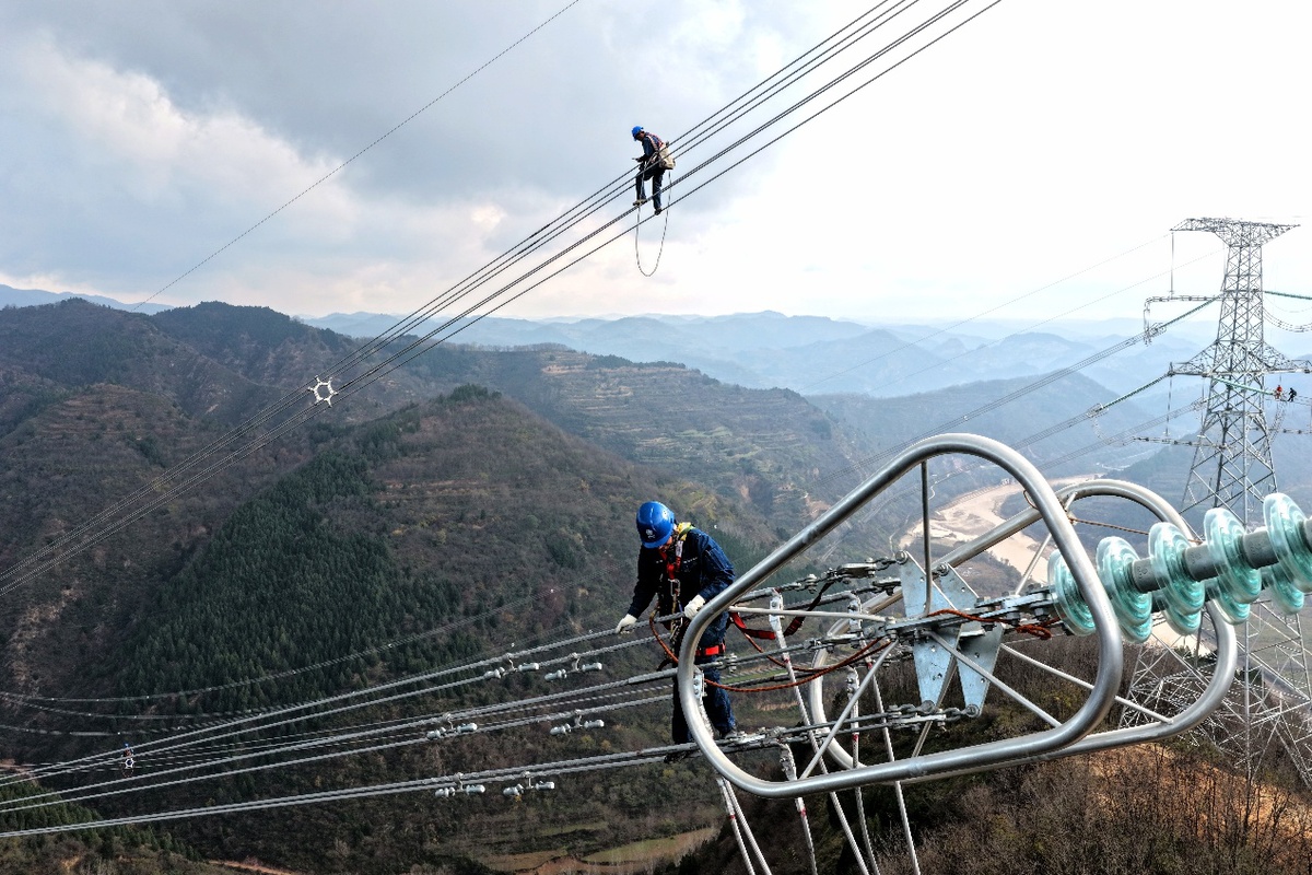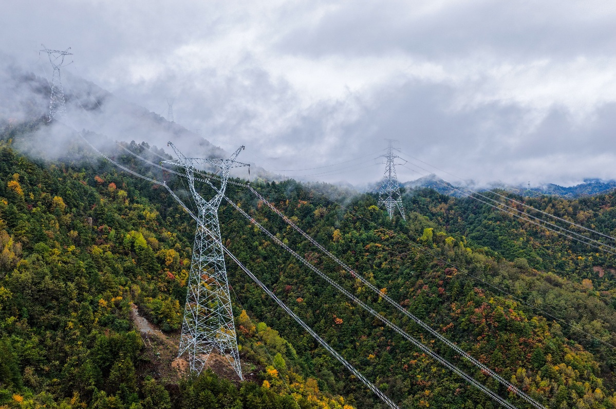 秦岭山区的输电铁塔与线路在冬季阳光下有序排布,这条输电工程连接能源基地、产业园区、城市与乡村,既保障电力稳定供应,也为新型电力系统构建及区域高质量发展提供能源保障。